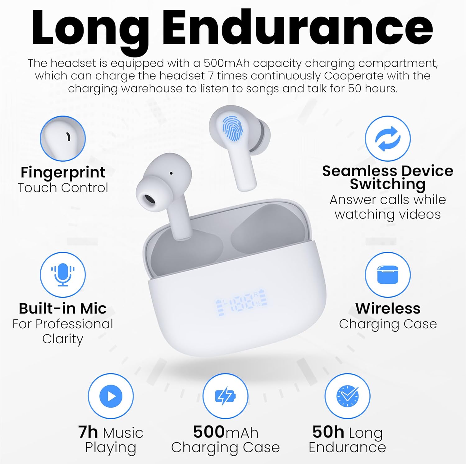Beleth Earset Pro1 Wireless Earbuds Bluetooth 5.4 Headphones, Dual Connectivity, 50H Playtime, ENC/ANC Noise Cancelling, Deep Bass, LED Display, Wireless Charging Case โ White